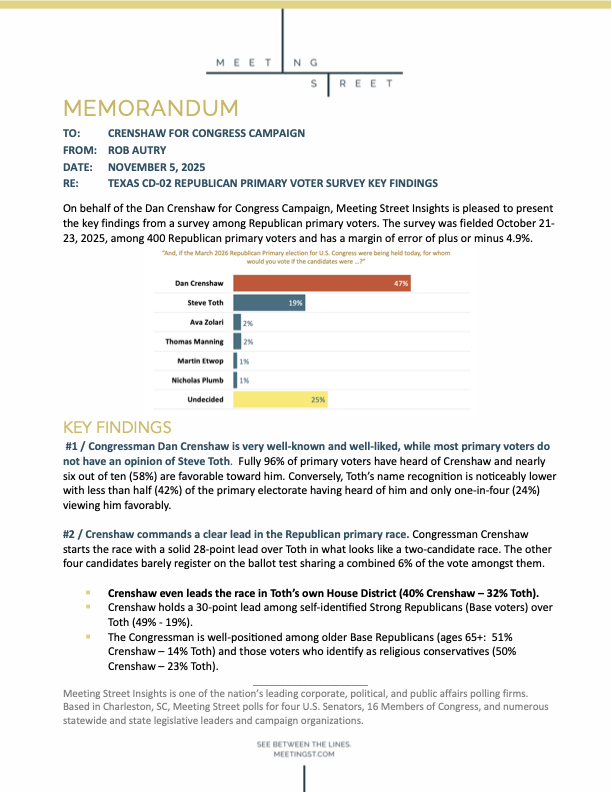 Some other findings from the poll, which can be viewed below, also show Congressman Crenshaw with a 30-point lead over Toth among self-identified Strong Republicans, and over a 25-point lead over Toth with voters who identify as religious conservatives.
