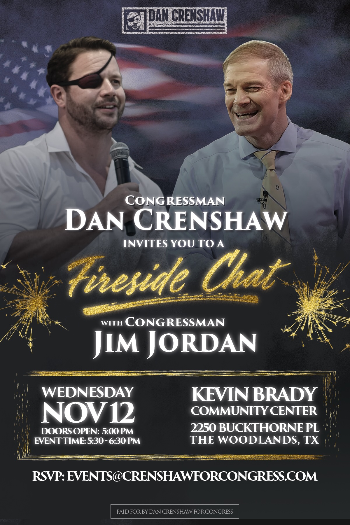 | You are cordially invited to join Congressman Dan Crenshaw for a Fireside Chat with Congressman Jim Jordan. This event is free to attend and open to the public. Please feel free to share the invitation with your family, friends, and neighbors! DATE: Wednesday, November 12, 2025 TIME: Doors Open: 5:00 PM CT Fireside Chat: 5:30 PM – 6:30 PM CT LOCATION: Kevin Brady Community Center 2250 Buckthorne Pl The Woodlands, TX 77380 RSVP is kindly requested. Please email ev****@*****************ss.com to let us know you’re coming. We look forward to seeing you on November 12th! In service, Team Crenshaw |