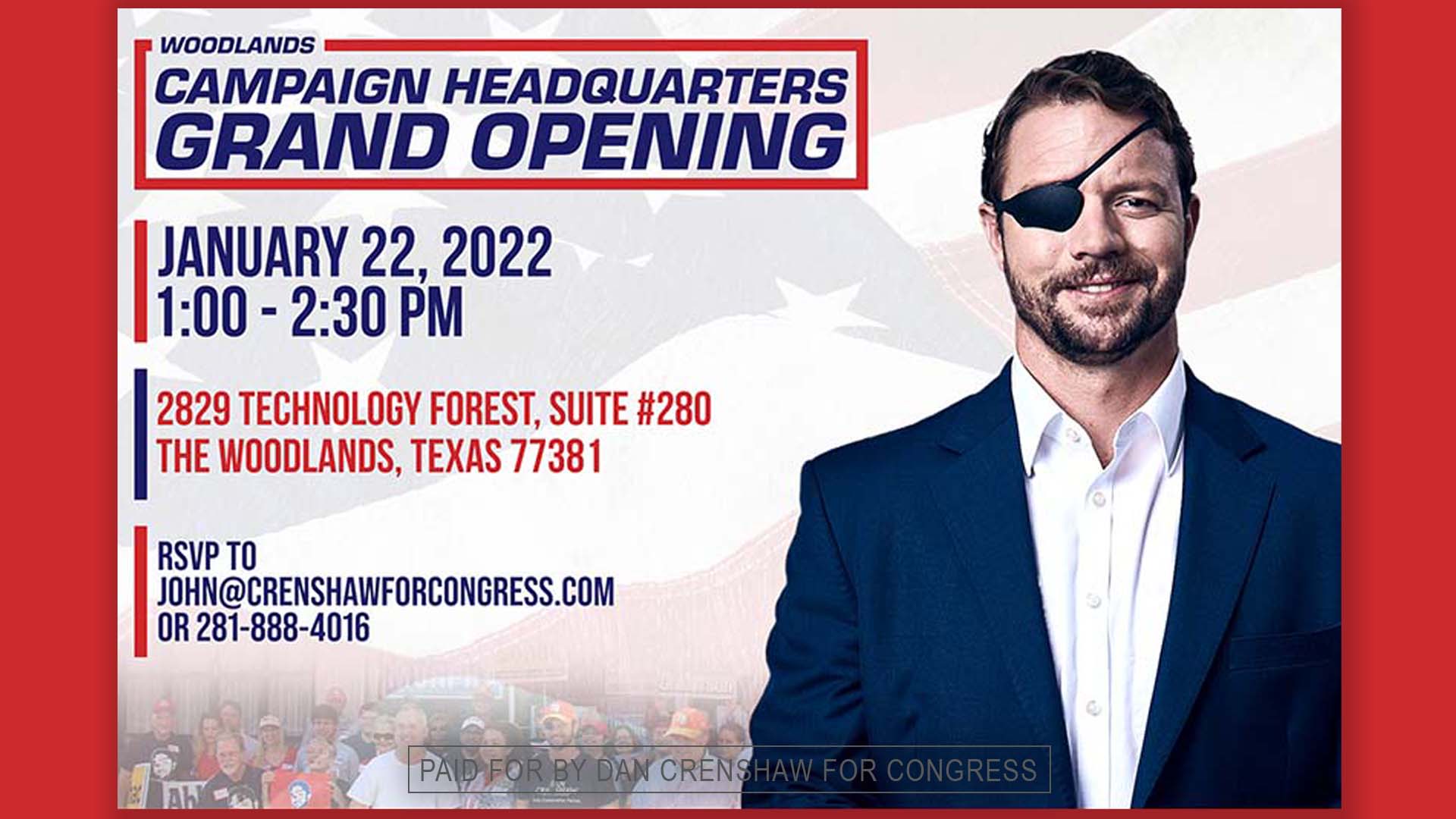 You are invited to the Grand Opening of Dan Crenshaw’s new campaign headquarters in The Woodlands this Saturday! Meet Dan and fellow patriots, grab some free swag and yard signs, and enjoy complimentary snacks and beverages. Jan 22nd from 1:00 – 2:30pm. 2829 Technology Forest, Suite 280, The Woodlands, TX 77381.